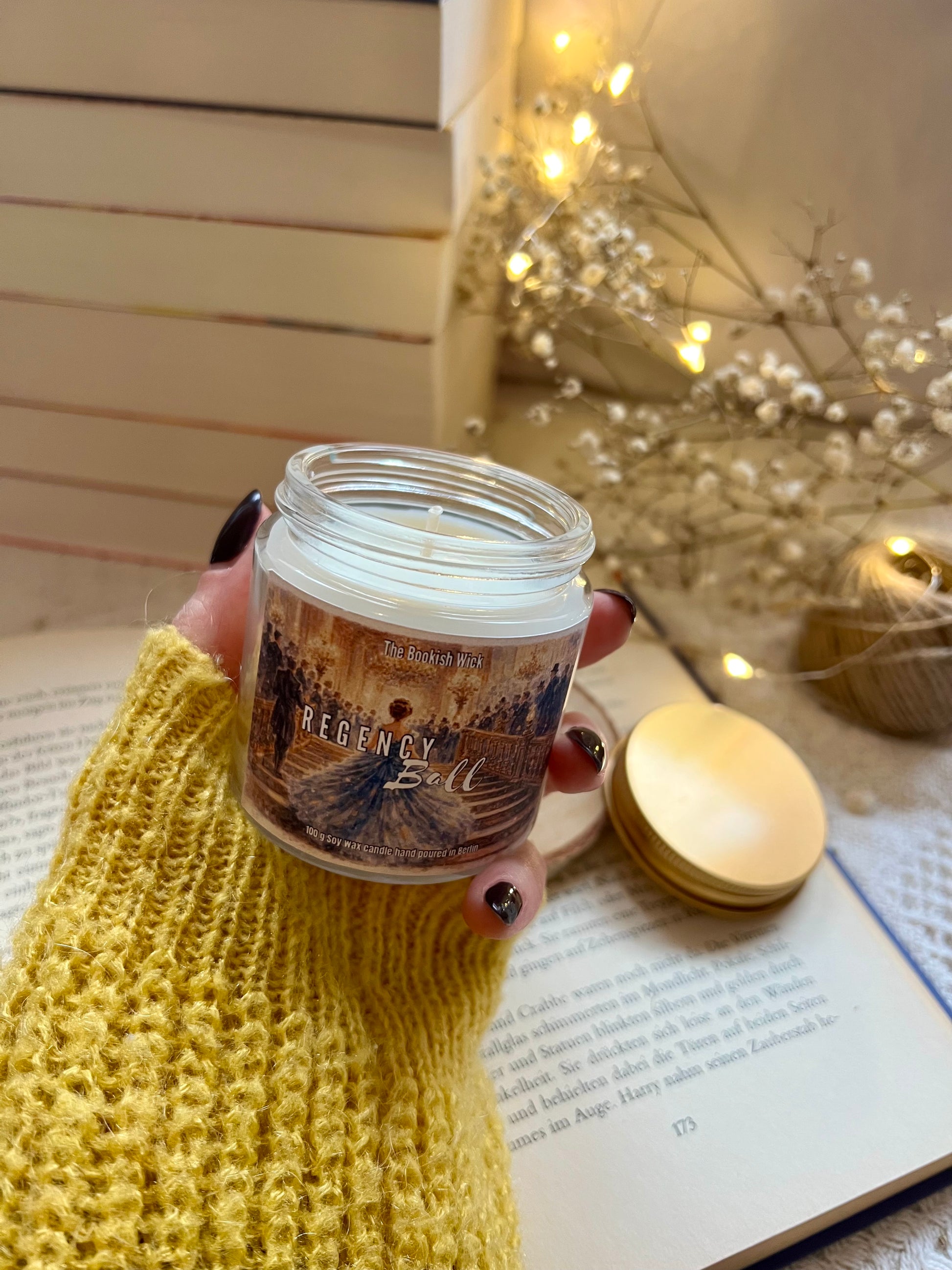 Süße Pfirsichnoten, inspiriert von einem Ball im Regency-Zeitalter. Diese Kerze bringt Bridgerton-Vibes, Drama und Romantik in deine Lesestunden.
